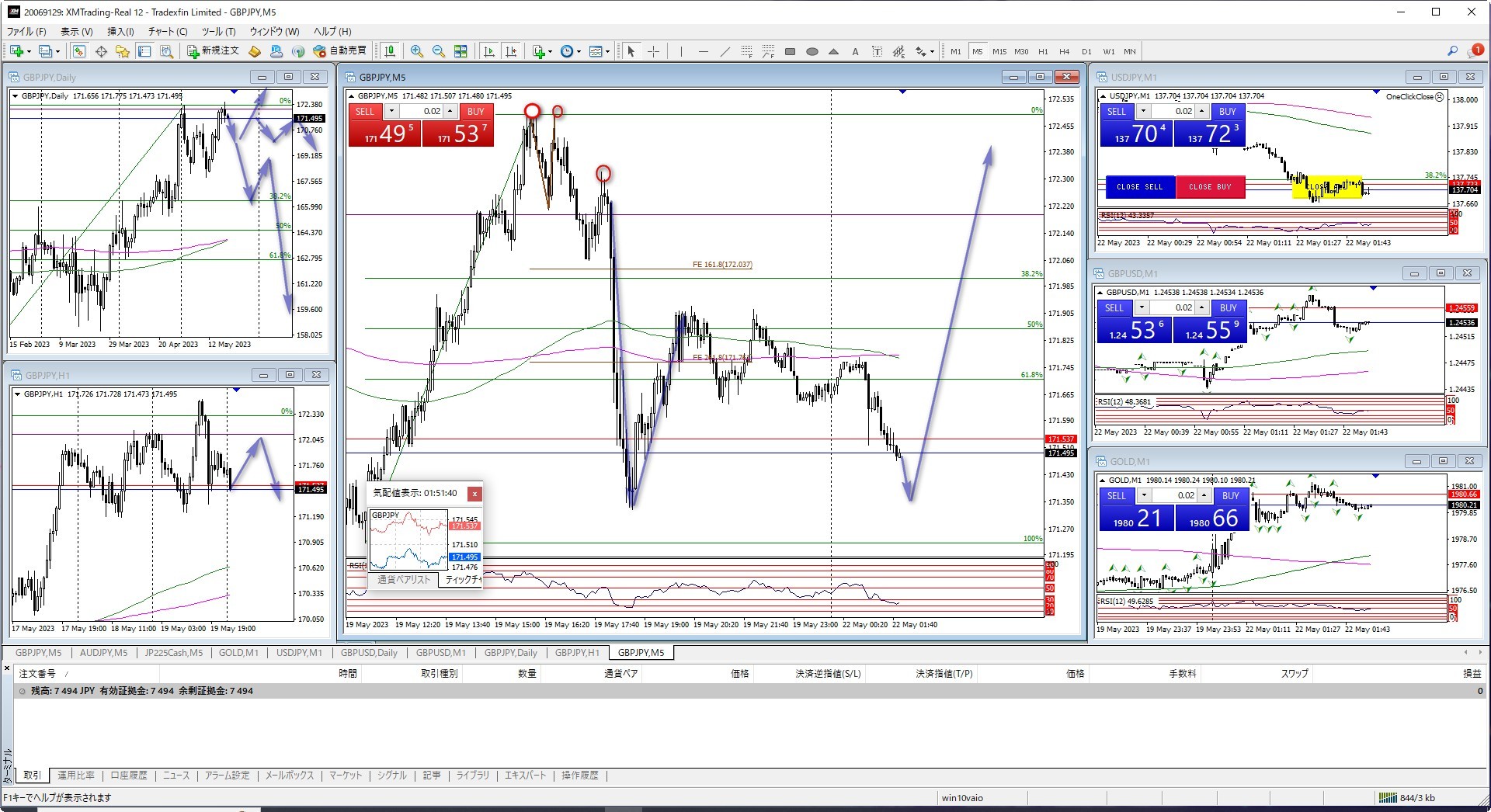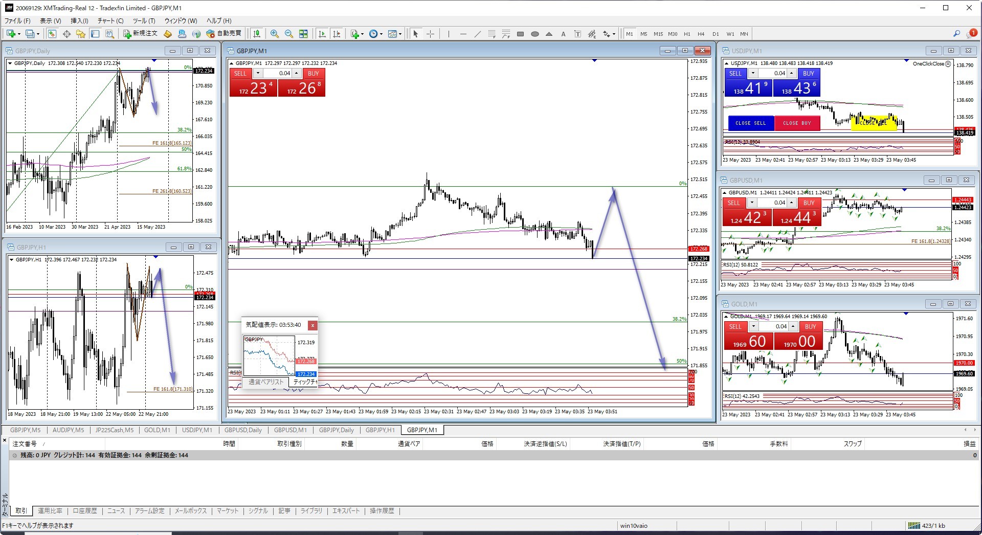 ・昨日の状況ダウントレンドに転換したが、その後上昇。トレンドを見誤り口座破綻で終了。・昨日の反省点 トレンドを見誤り口座破綻SL設定をする等対策を打つ ・本日の予測H4依然としてアップトレンドだがダブルトップで転換期にもある。転換すればFE161.8まで下落するとみるH1直近急上昇地点までは下げる可能性を考えつつ更なる上昇にも注意が必要。M5ロンドンタイムよりトレードをスタートする